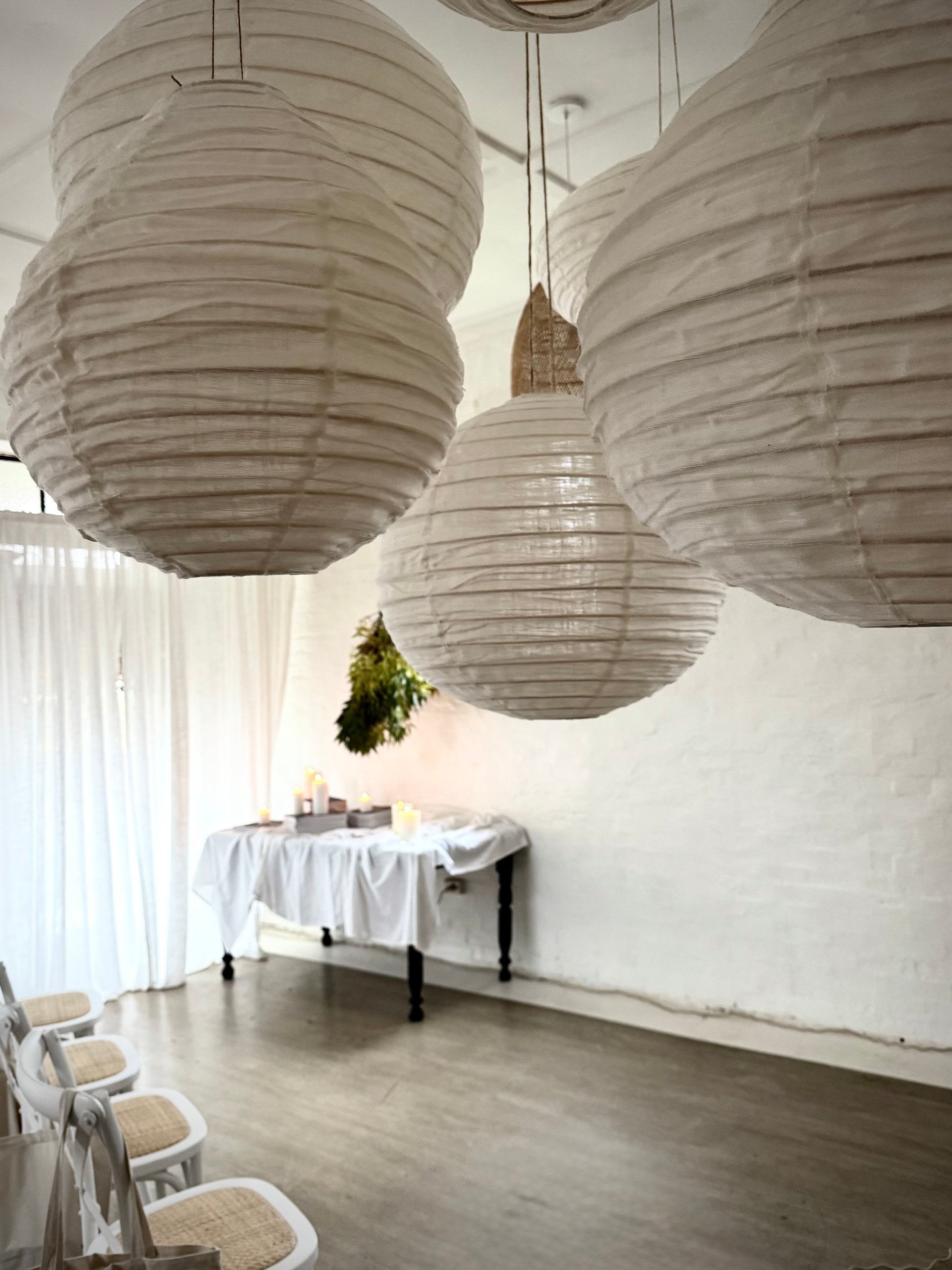 Ethereal floating round linen pendant light on a cane frame.