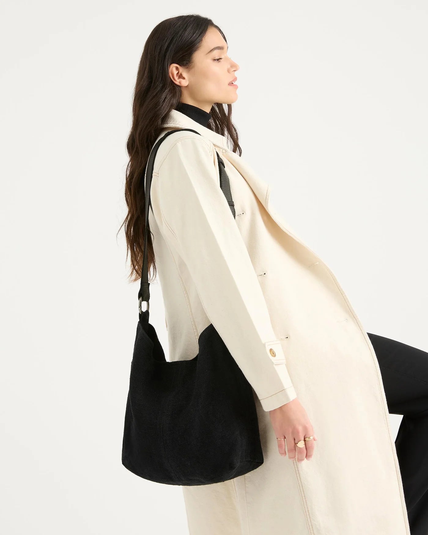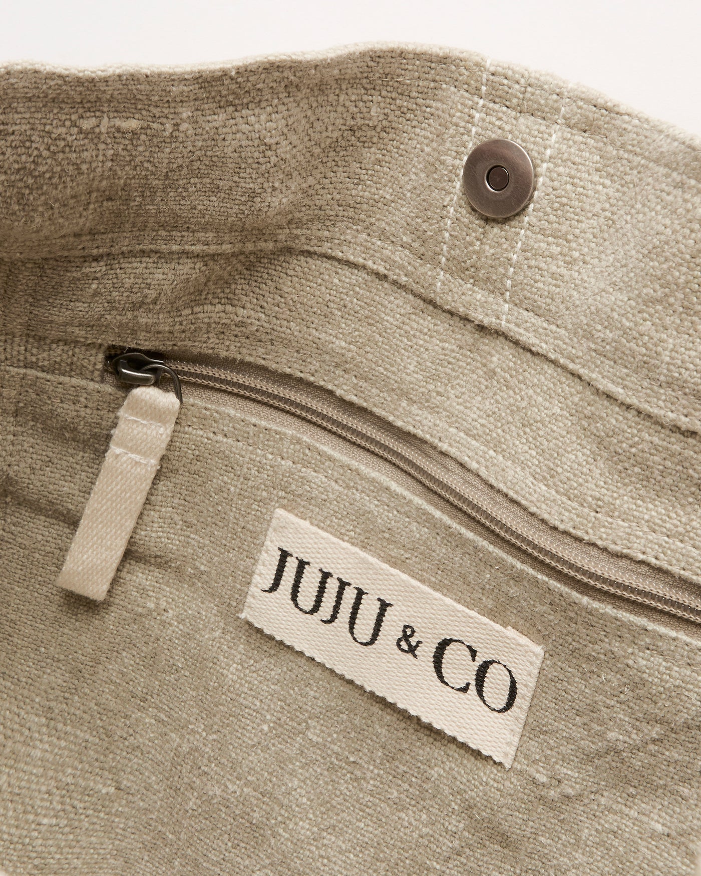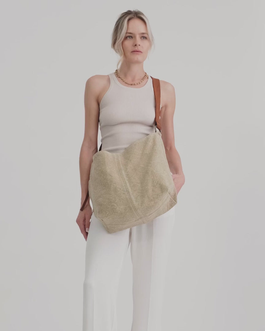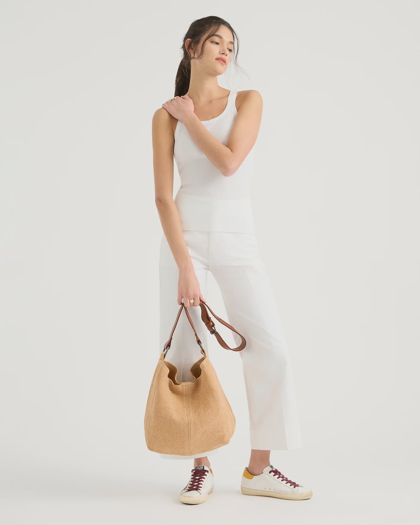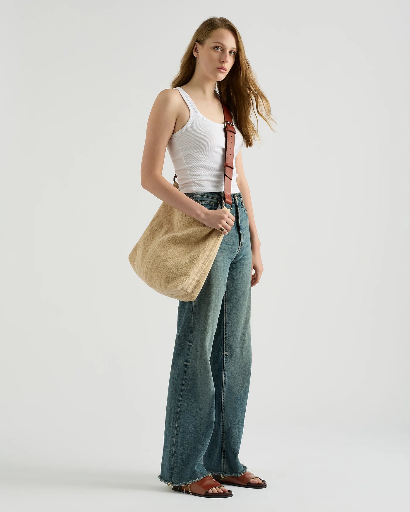 The Baby Jute is the smaller model of our timeless Beach Jute. The lightweight material and wide leather strap allow for constant comfort throughout the day. Though smaller than the Beach, the Baby is spacious enough for any daily essentials, as well asbooks or a laptop. Adjust the strap to wear as a shoulder bag or crossbody.