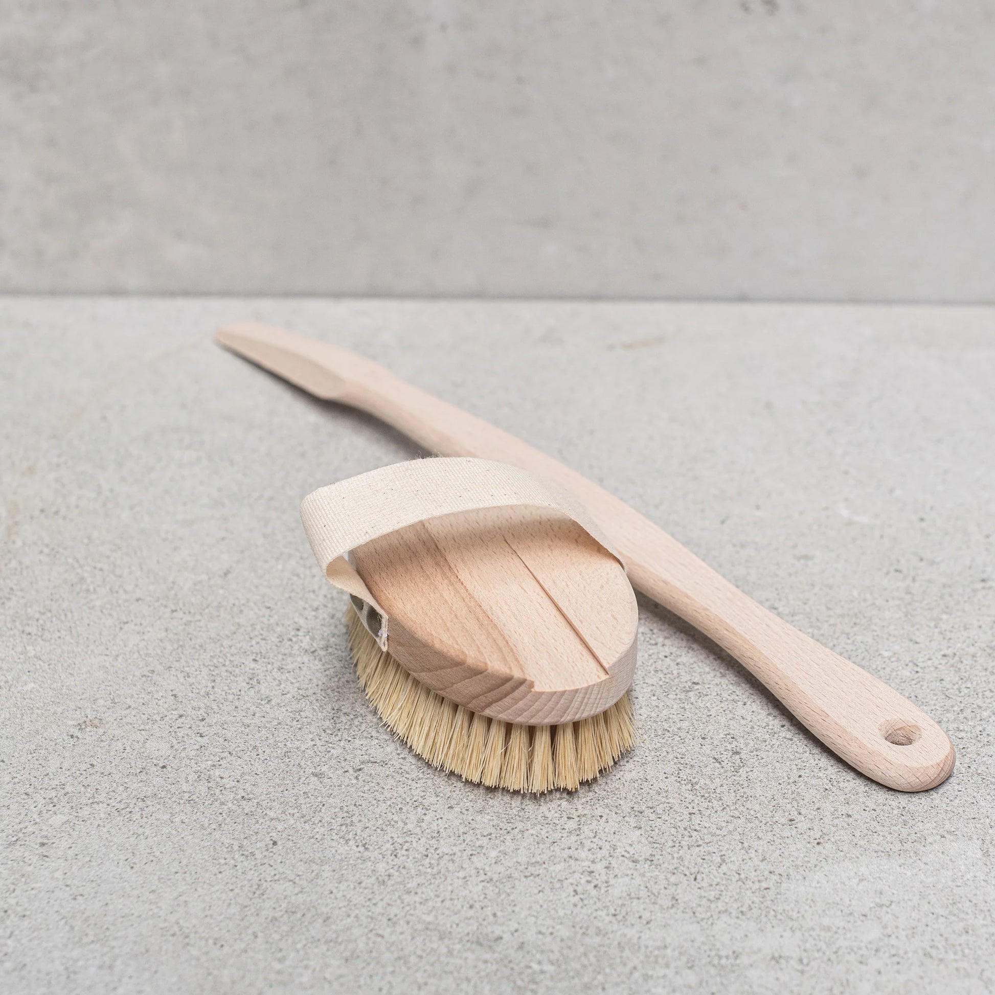 Vegan Tampico Bath Brush has a long handle and a detachable brush head made of the finest Tampico plant bristles. A canvas hand strap with brass studs makes this a versatile bathroom addition.
