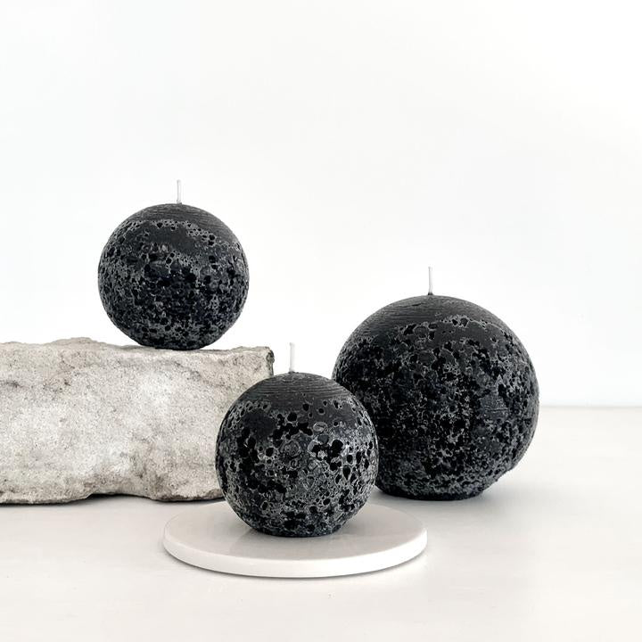 A compact Sphere Candle with a dramatic black texture. Dark Moon candle collection.