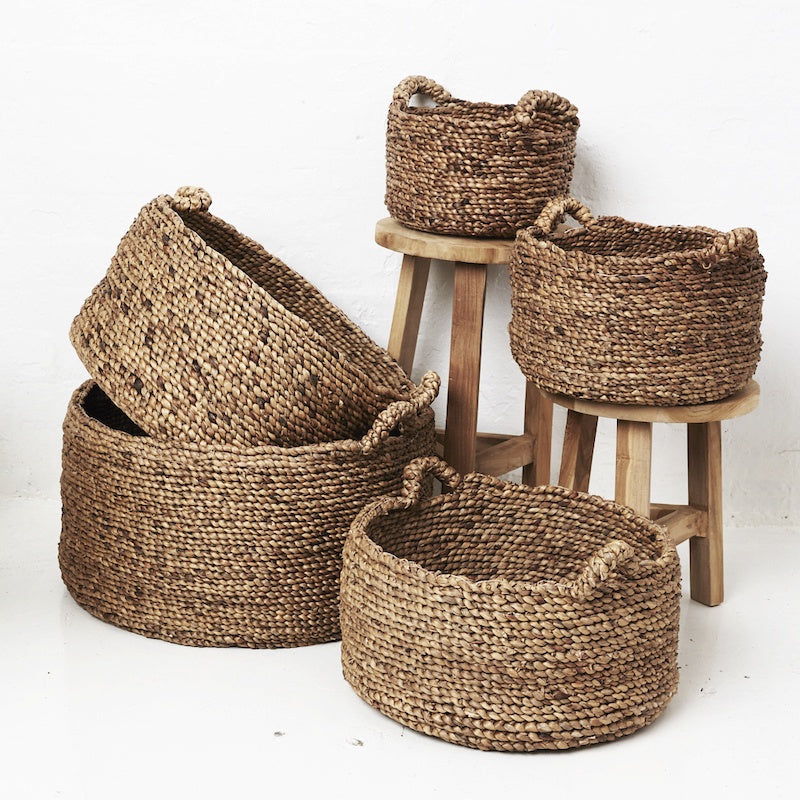 Handwoven waterhyacinth baskets made in Java, Indonesia. Five sizes which all fit inside one another nicely.