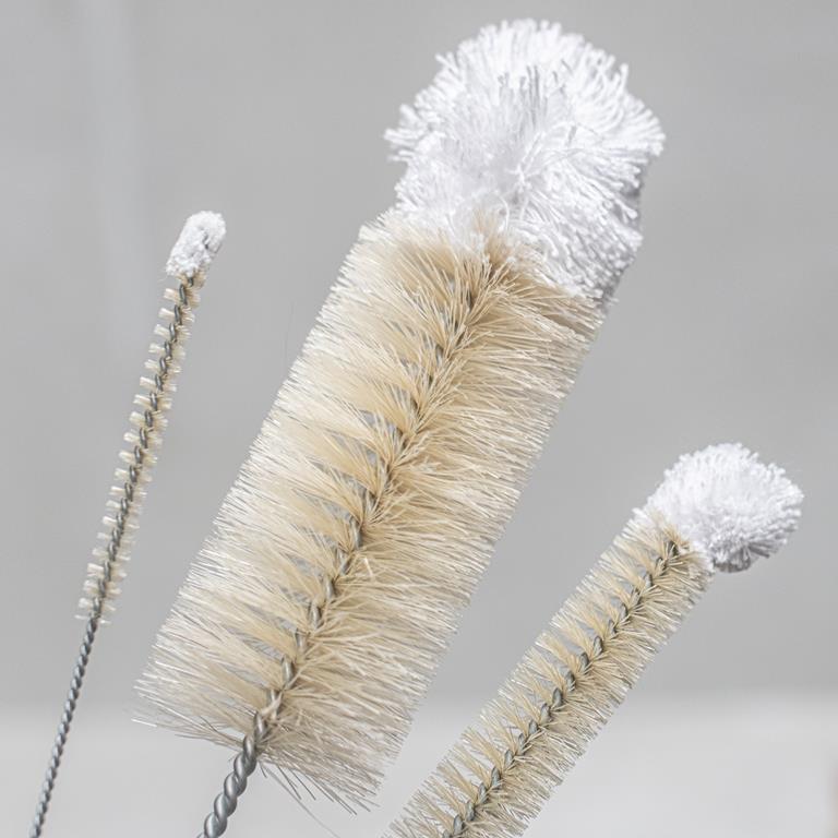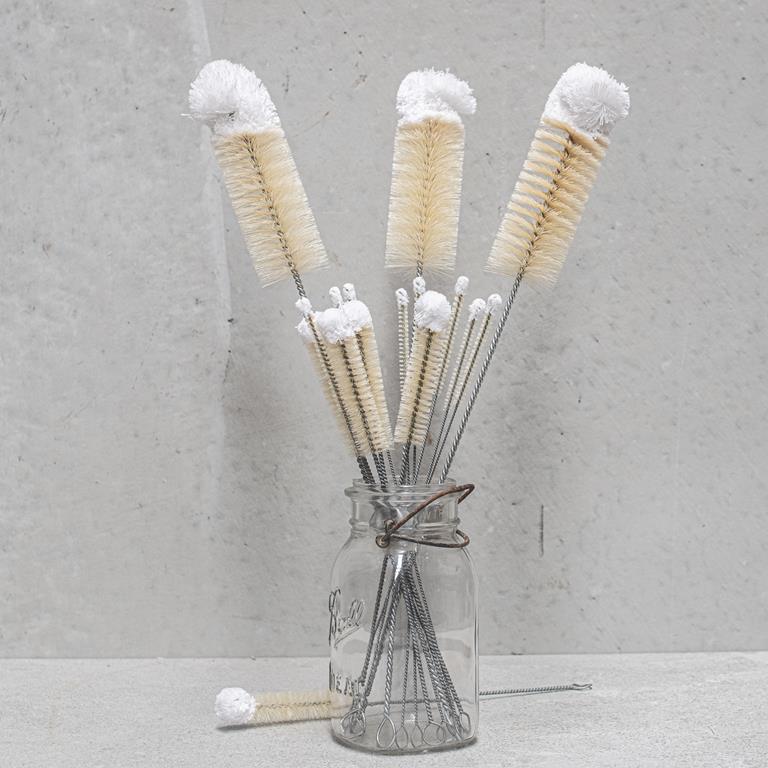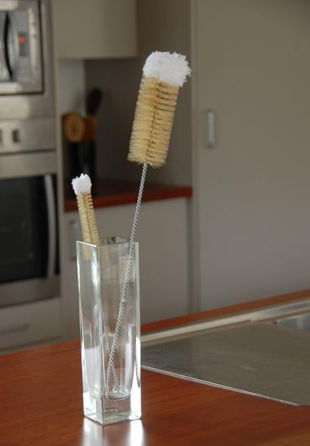 Made of natural materials and is so much more durable than synthetic brushes, and even more pleasing to use. On a wire stem, this hangs after use. White cotton wool top at the end gets to the tip vase or bottle and the sides operate like a mini car wash! Mini is a slim line bottle brush, perfect for the bottom of narrow vases, children's drink bottles and delicate champagne flutes.Handmade in Germany.