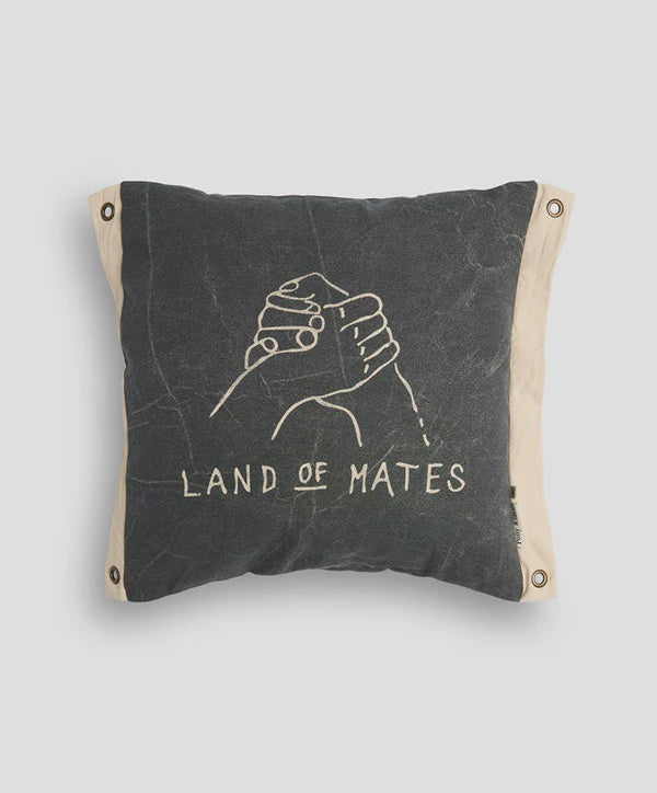 A symbol of true friendship and solidarity—the Land of Mates Cushion X Banner is built to last in sturdy black cotton canvas. This adaptable piece moves easily from cushion cover to a bold wall banner with integrated eyelets for easy hanging.