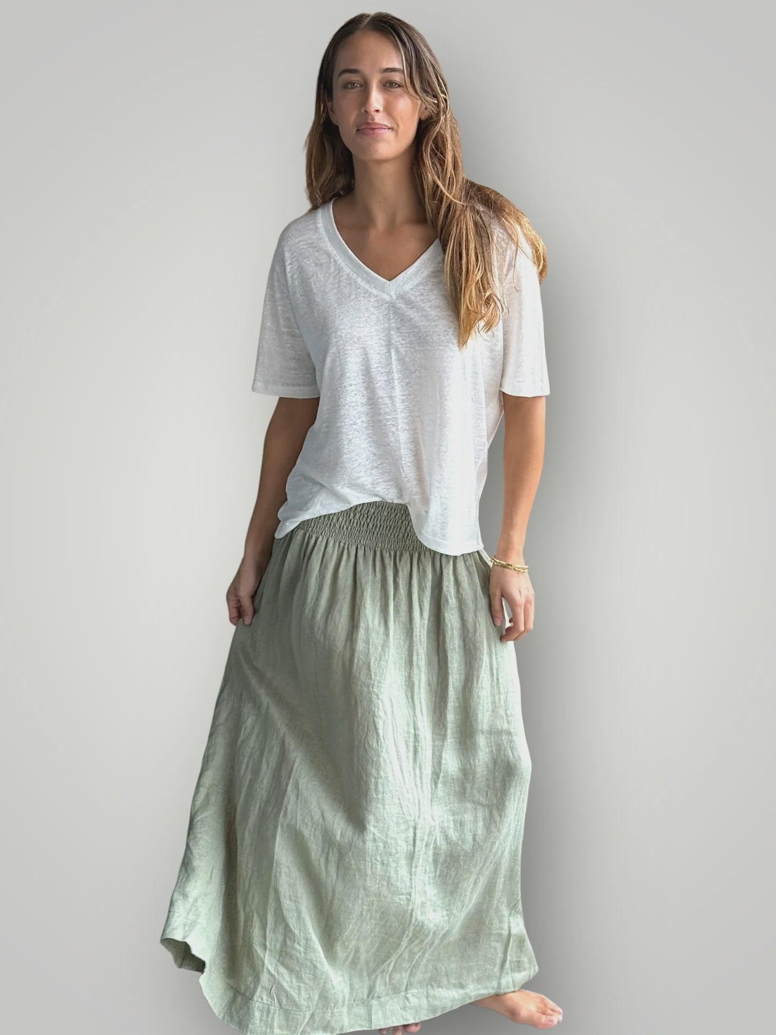 such a beautiful light weight skirt, looks better when twisted before you wear for that "pleated" look. 100% washed European linen-light weight