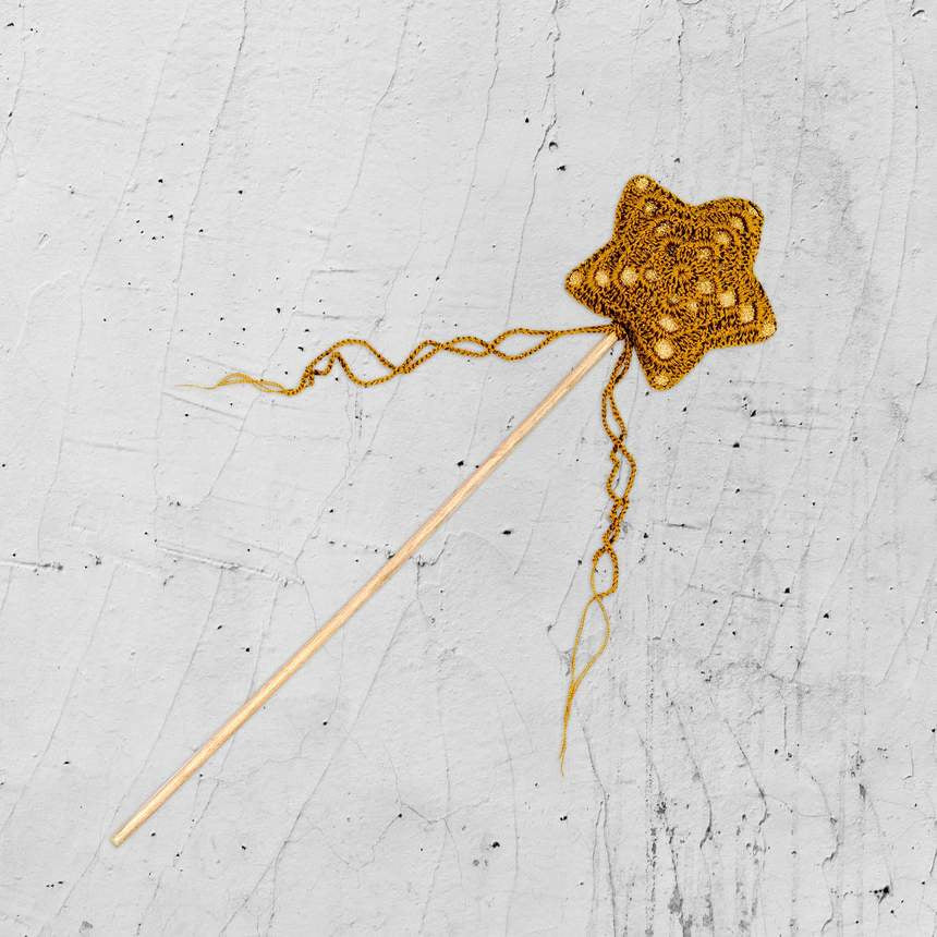 Magic wand made of a painted wooden stick and a padded crochet star, with lining and crocheted strings.