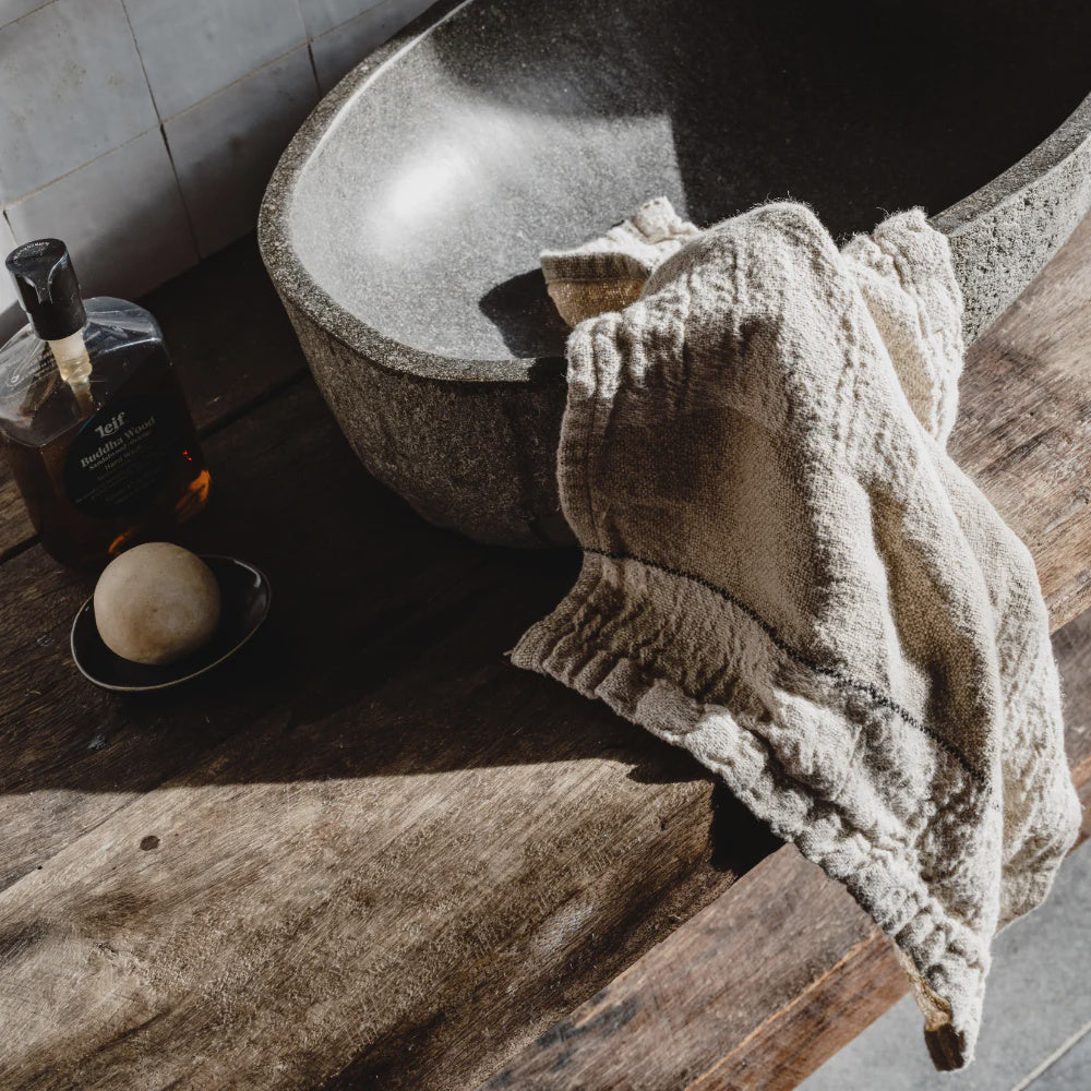 We are delighted to introduce a new addition to our 100% handwoven family, the Retreat Hand Towel. This hand-crafted piece features a rustic stripe design that evokes the layered beauty of a coastline, with intricate depths of parallel tones and rich textural appeal that adds craftmanship and rustic beauty to any bathroom. Crafted from a cotton/linen blend for softness and durability.