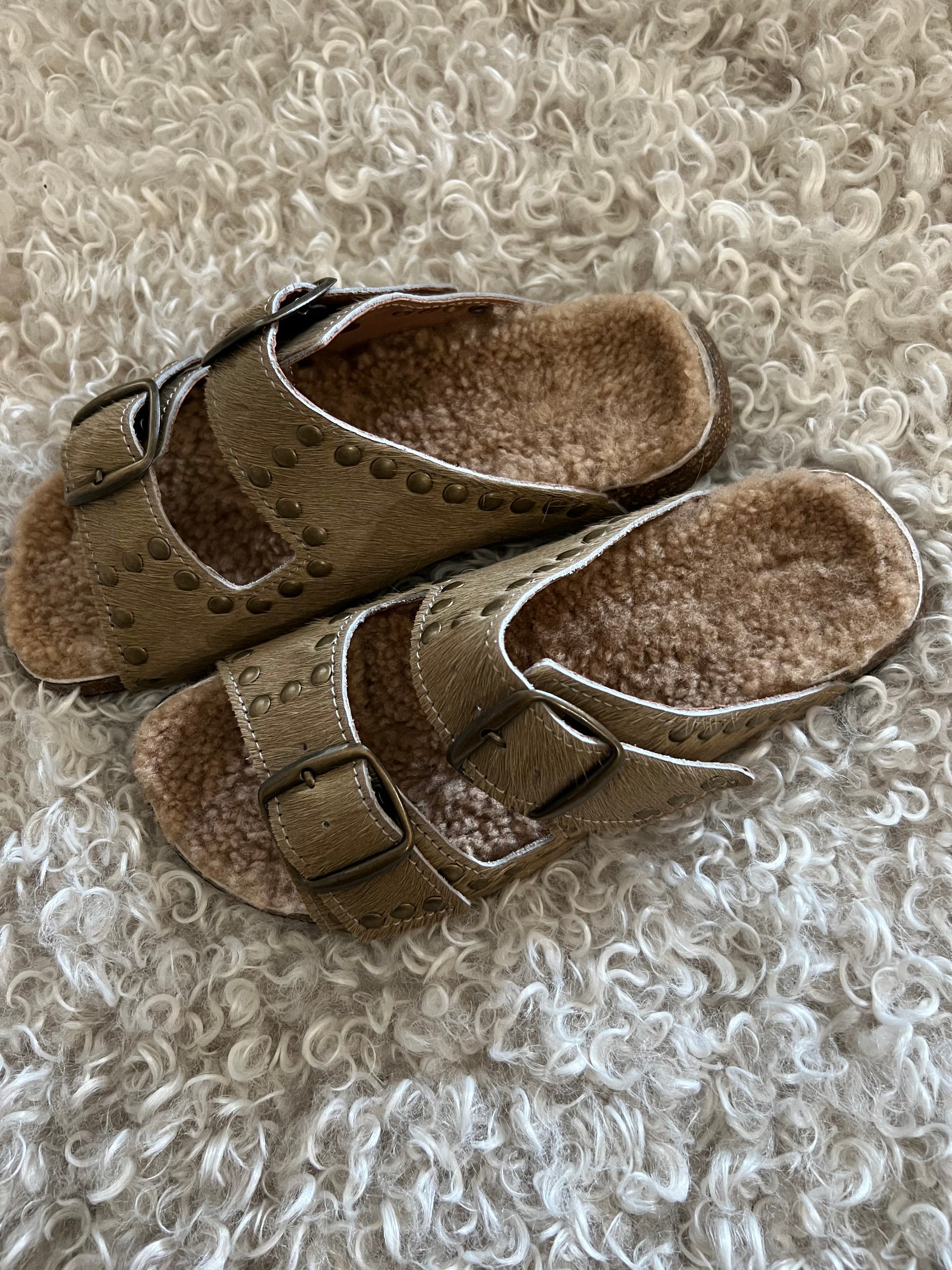 Bosabo slides are so stylish for every day and every occasion and super comfortable. Our warm winter slides are Taupe Pony Hair suede with bronze studs and adjustable buckles, molded cork foot-bed and lined with Taupe shearling. Hand made in France.