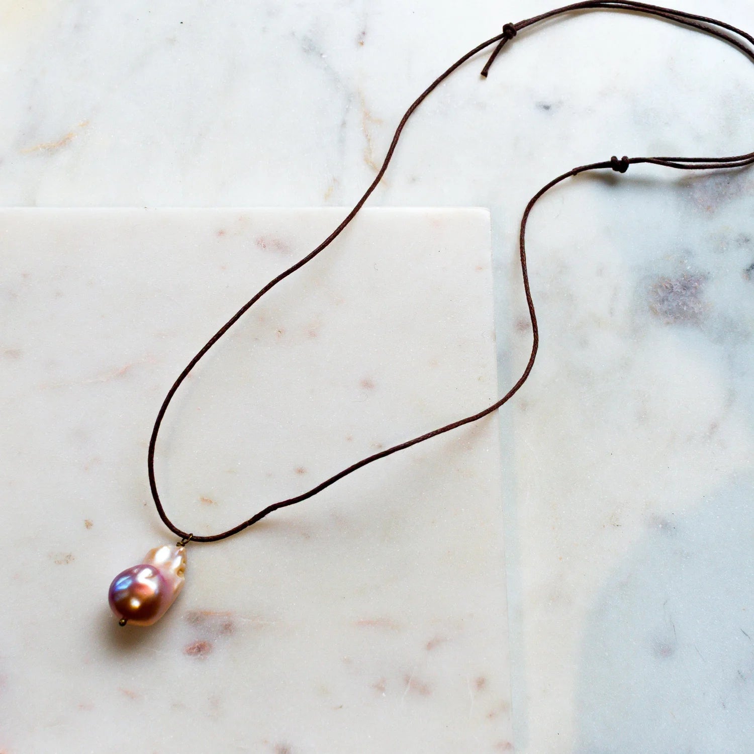 The AURELIA necklace pairs a soft pink baroque freshwater pearl with an adjustable brown cotton cord. Natural and understated, it’s perfect for everyday wear, with the unique pearl adding a touch of individuality to every piece.