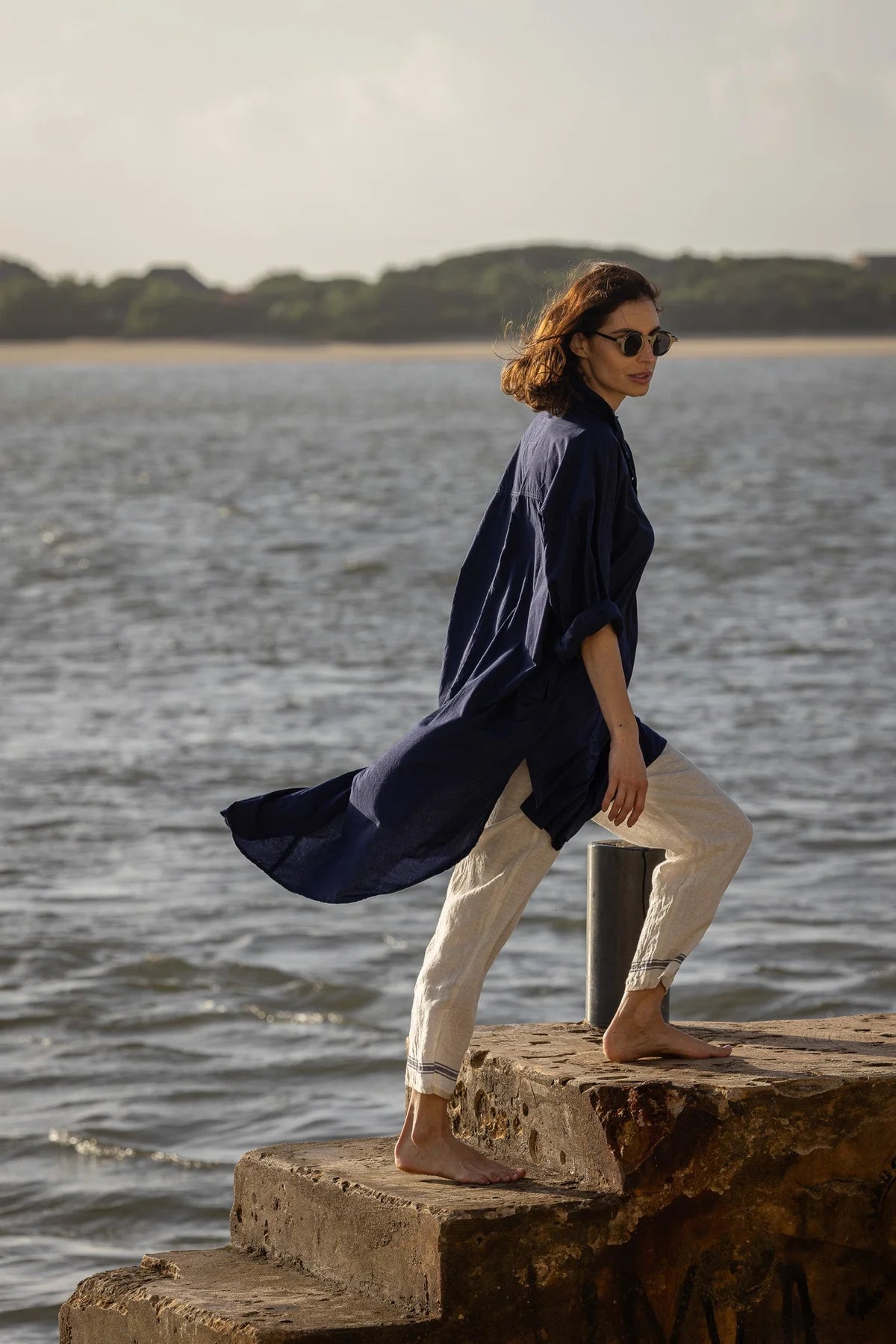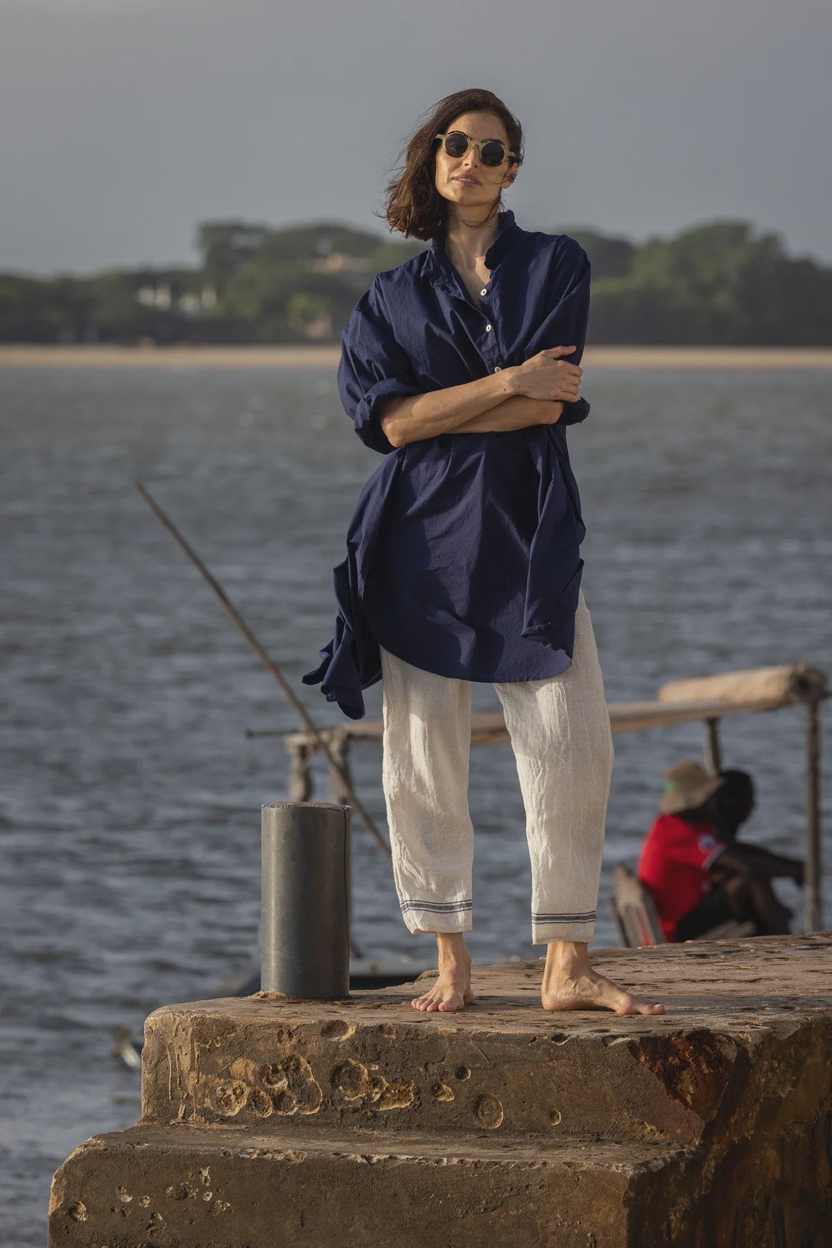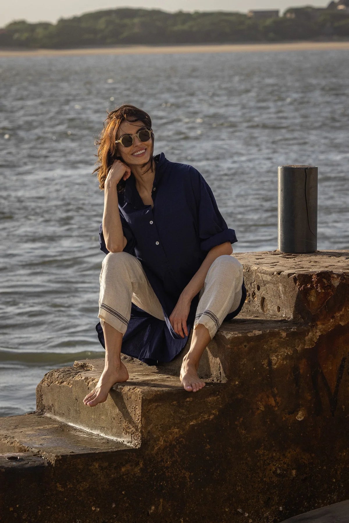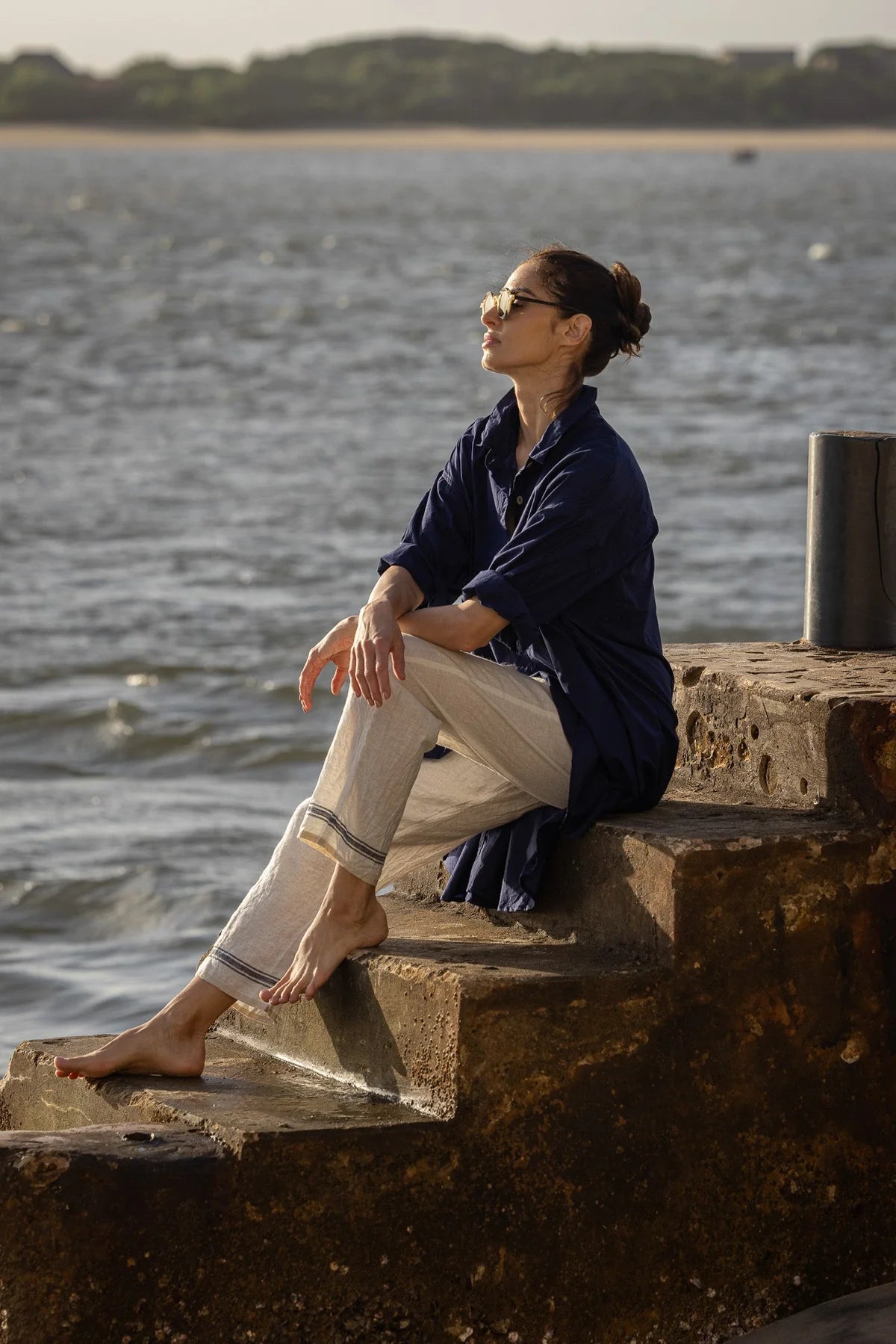 Our Petticoat Pants are crafted from breathable linen in a relaxed cigarette fit. The elasticated waistband ensures absolute comfort, while the clean silhouette is accented by a striped hem designed to peek out beneath dresses and shirts. Perfect for adding subtle dimension to your summer layers, preventing dreaded thigh chafing on warm days, or bringing effortless modesty to any outfit. Simple, practical, and made to layer.