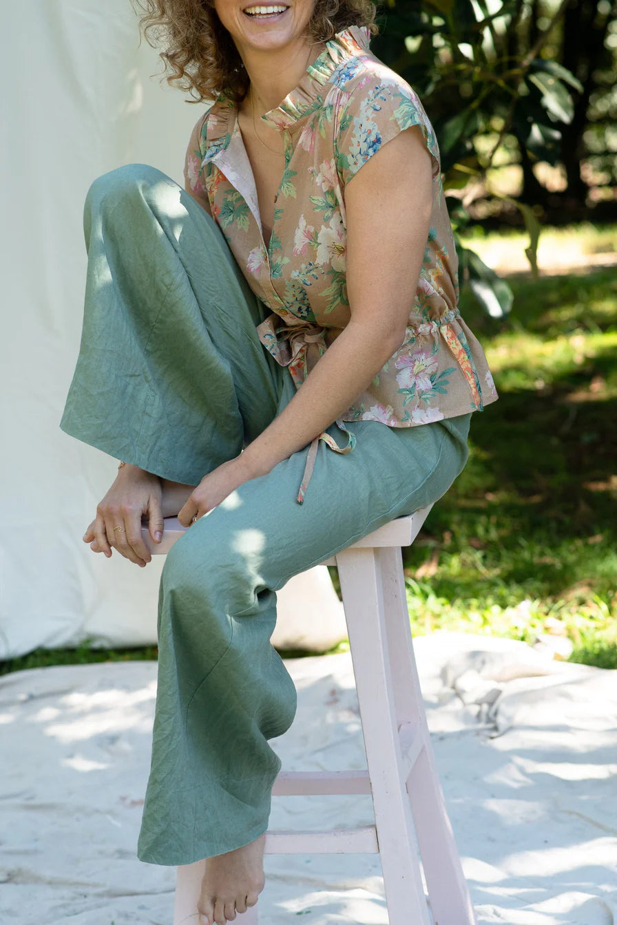 Helene wear Vida top in Flora back with Ollie linen pant in Mineral Green in Size S